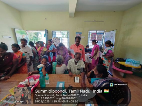Dr. Kabilan guided the TANKER Awareness and Prevention Program (TAPP) team of TANKER Foundation during the screening camp conducted at Sirupuzhalpettai, Gummidipoondi in Tiruvallur district Thursday, September 25, 2025. A total of 11 high-risk individuals were referred to the nearest primary health centre for further evaluation and follow-up.
