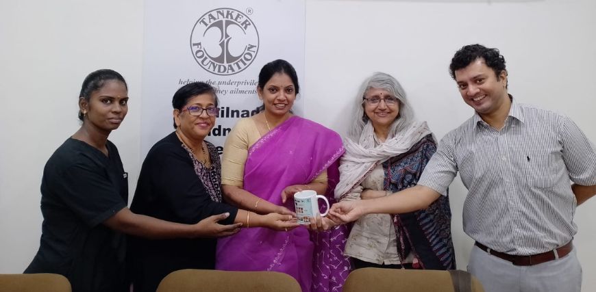 Mr. George presented the TANKER memento, which is a personalised, special, ceramic mug, to Dr. Yoshita Kota. The mug contains a map indicating the location of 15 TANKER Foundation dialysis units and the images of the trustees, the Head of the awareness team and the CME Committee members.